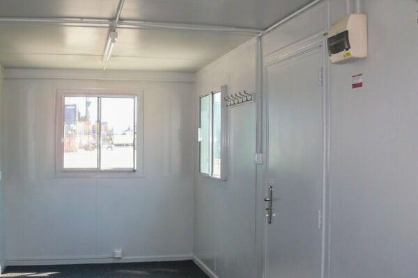 O escritório de contêiner padrão de 20 pés inclui um espaço com uma área de cozinha e banheiros separados. Acessamos o recipiente por uma porta pessoal exclusiva em aço anti-vandalismo, ele possui um obturador de vidros duplos oferece iluminação e ventilação naturais.